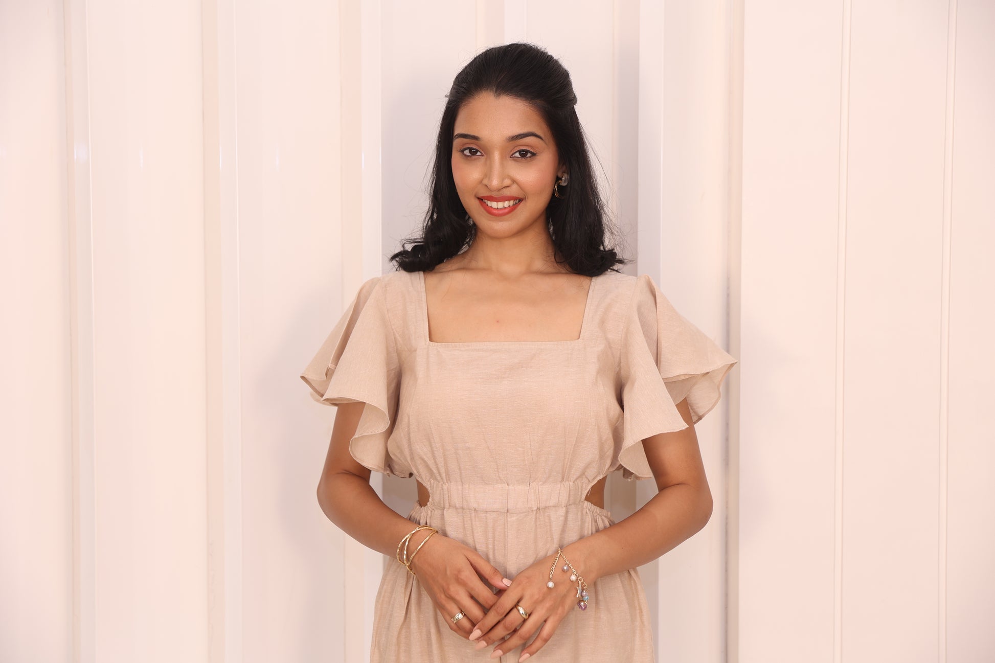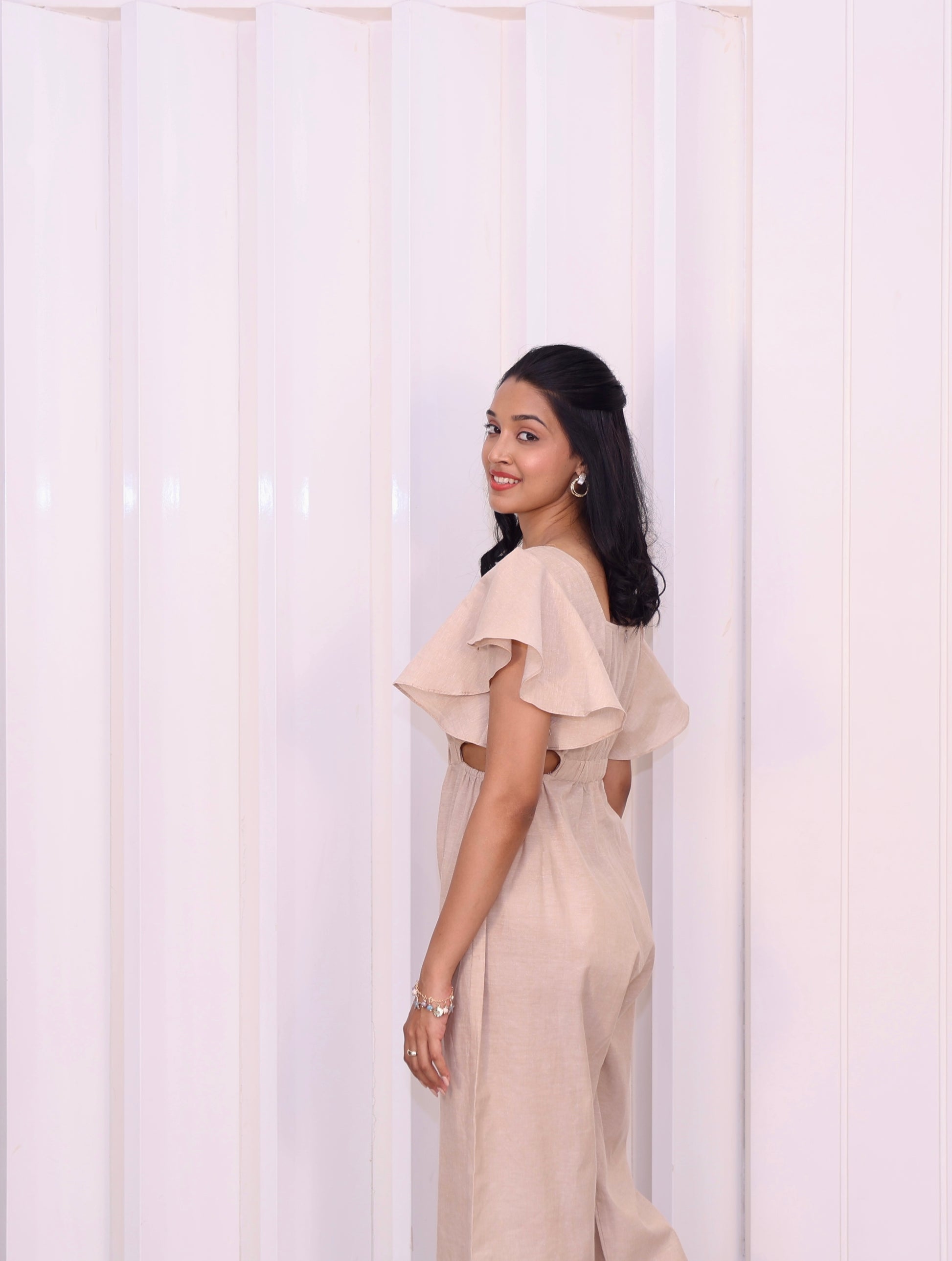 Introducing our Beige Jumpsuit: Your Ultimate Style Companion. With its alluring cut-out detailing on the waist and statement short frill sleeves, this jumpsuit is designed to turn heads.