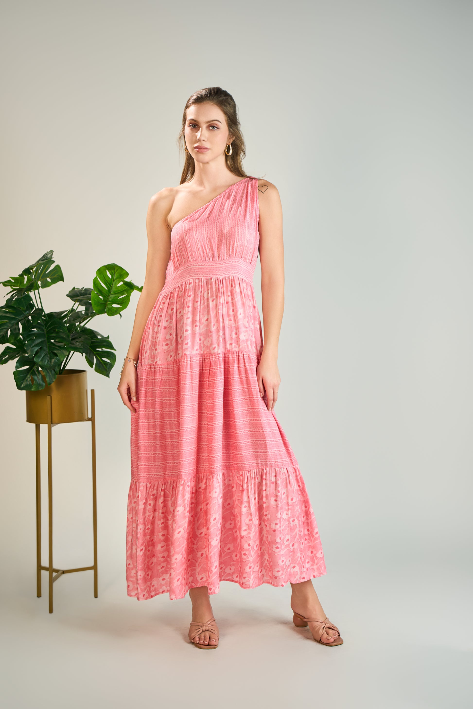 Our Pink One-Shoulder Long Dress, made from pure muslin, features a knot detail on the shoulder and a flowy, elegant silhouette.