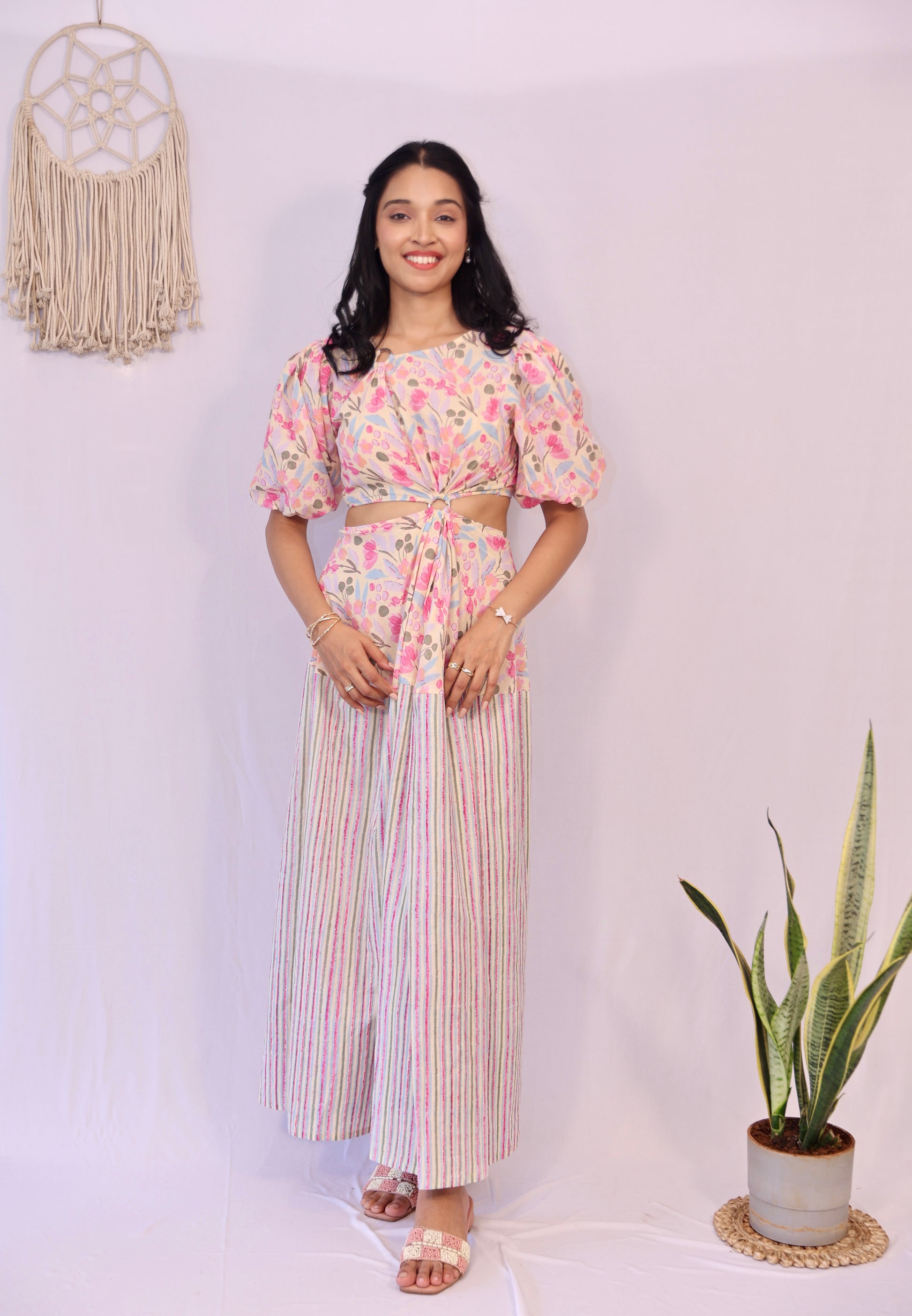 Introducing our Pure Cotton Floral and Striped Dress: A Fusion of Elegance and Edge. Featuring a statement cutout detailing on the waist and exquisite neck detailing, this dress is designed to turn heads wherever you go.