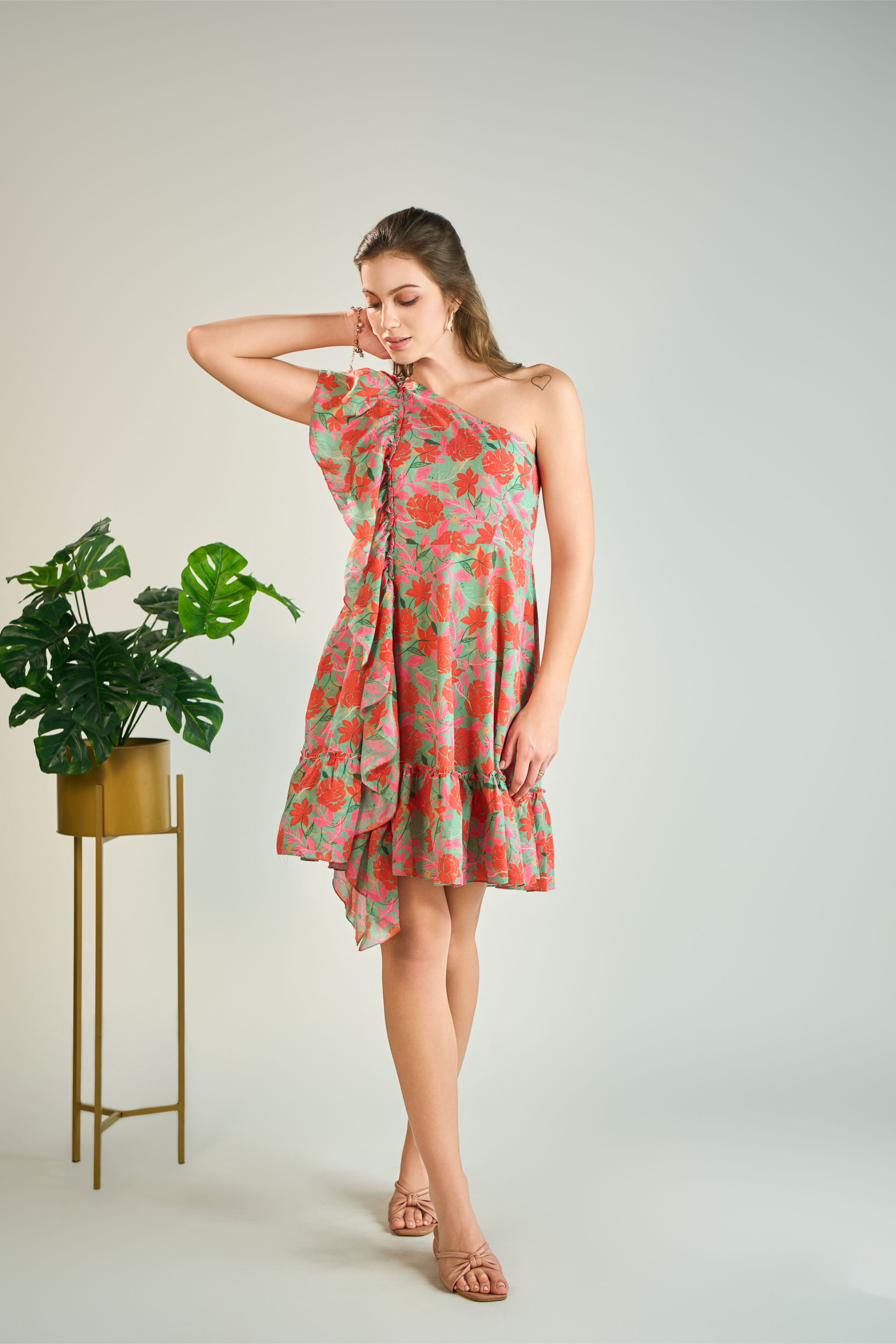 A green and pink frill dress combines the freshness of green with the charm of pink, adorned with delicate frills for a feminine and playful touch. Ideal for a fun and stylish ensemble, perfect for any occasion.