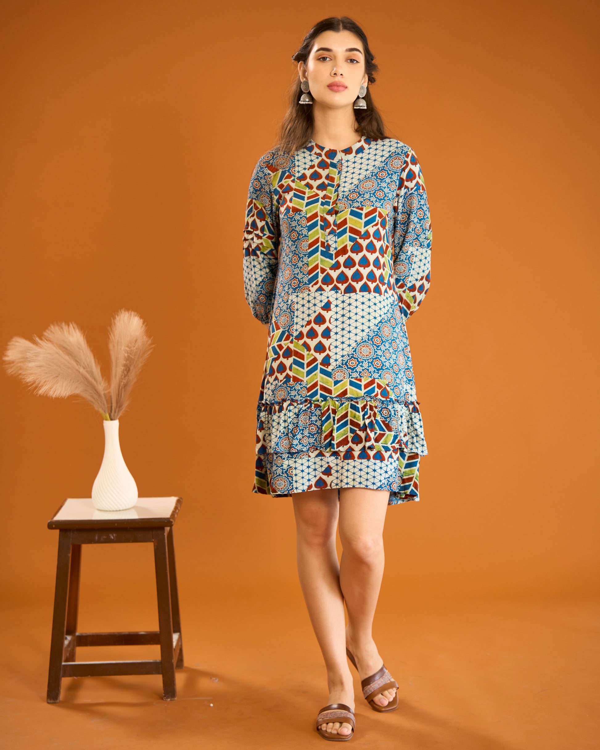 Indigo Mix Print Frill Dress