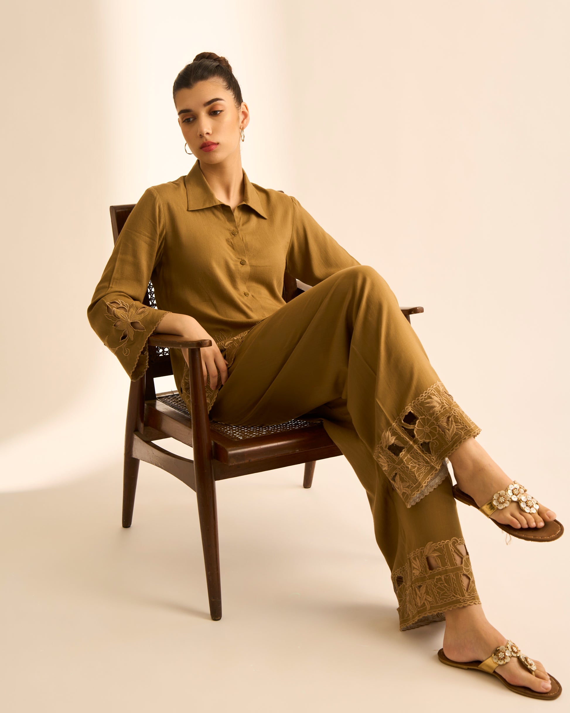 Elegantly designed, in soothing olive hues , this pure cotton coord set showcases intricate cutwork detailing, making it a versatile ensemble, suitable for both casual and formal gatherings