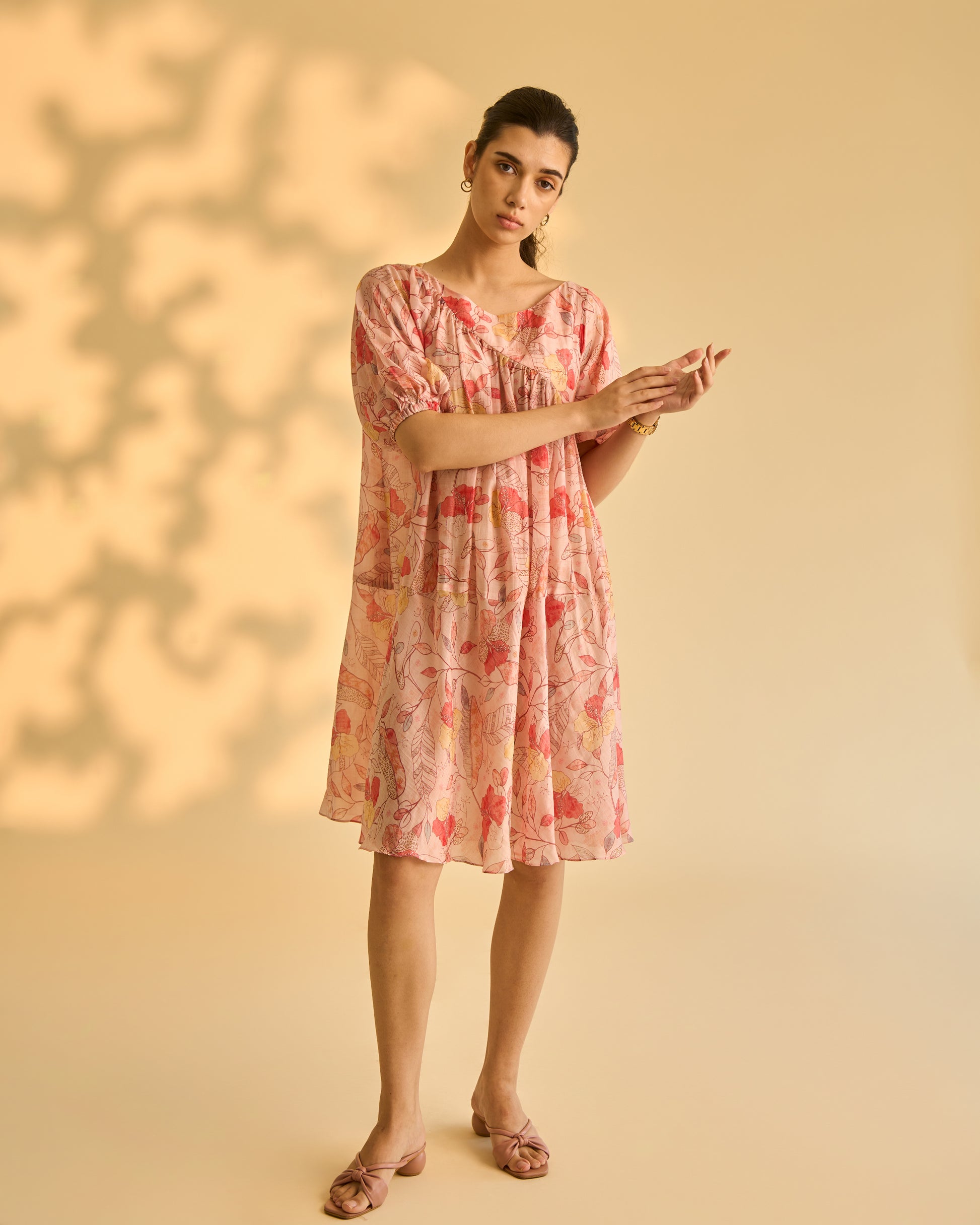 Upgrade your wardrobe in this pink muslin dress, adorned with a lively floral print, offering a fresh burst of color and style.
