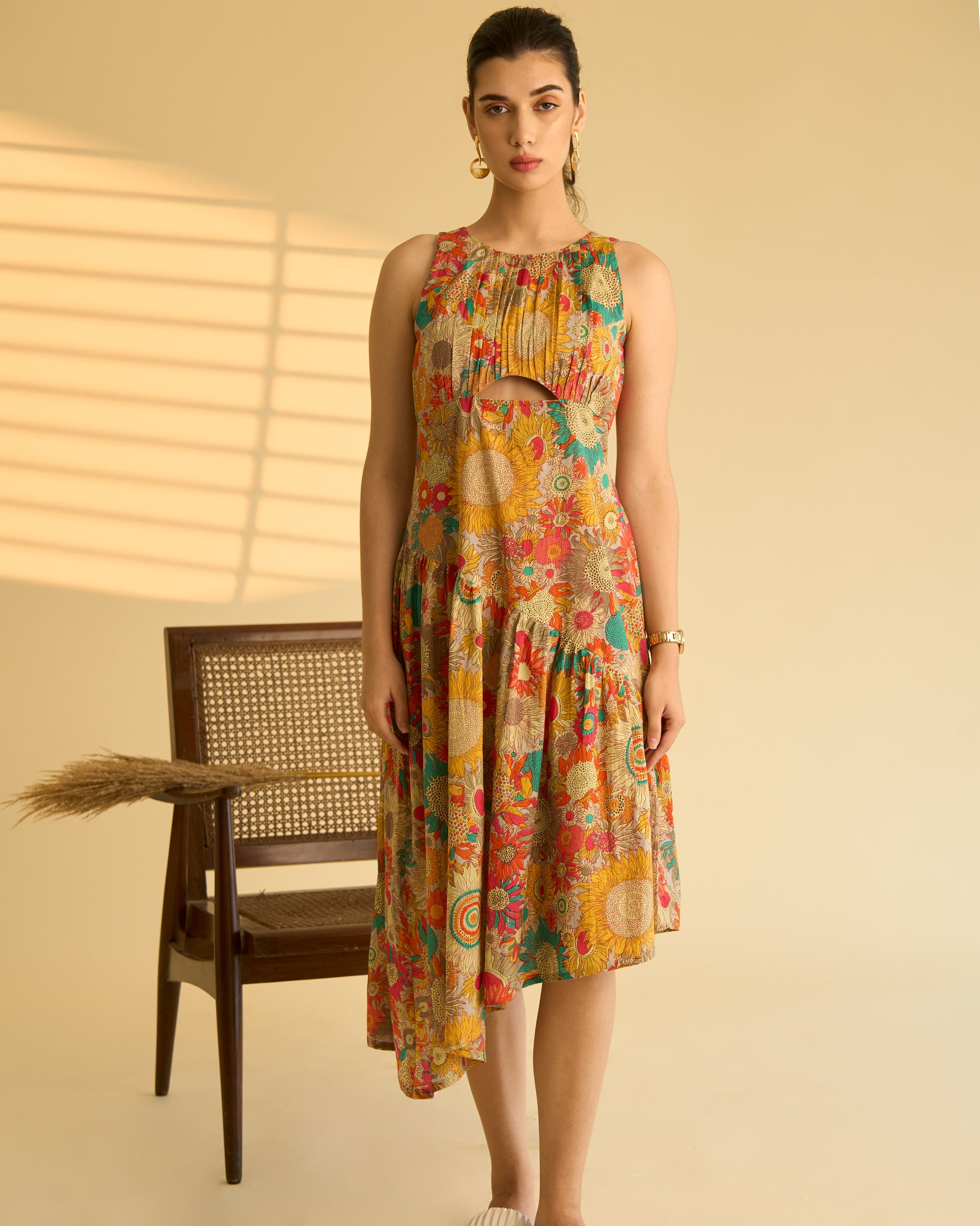 Radiate sunny vibes in this pure cotton midi high low dress, adorned with vibrant sunflower print, featuring a playful cutout design and sleeveless silhouette for a fresh flirty look
